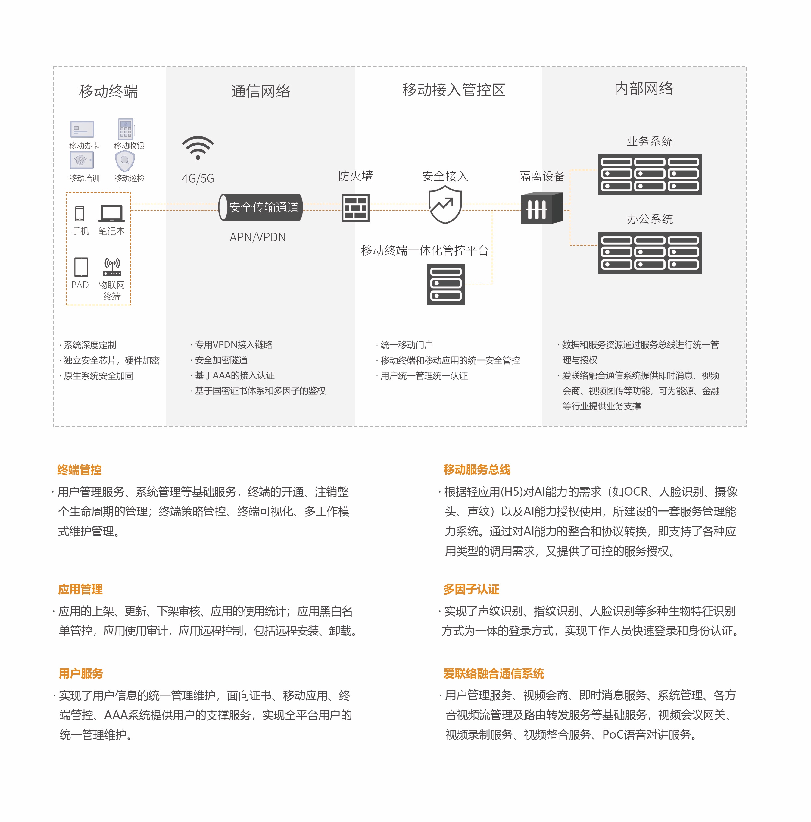 移動(dòng)信息化技術(shù)與應(yīng)用的發(fā)展正在改變傳統(tǒng)的政企機(jī)構(gòu)辦公與運(yùn)營(yíng)方式,通過(guò)移動(dòng)辦公,突破了時(shí)間、空間的障礙,提高了政企機(jī)構(gòu)的運(yùn)營(yíng)效率,為政企機(jī)構(gòu)的管理和業(yè)務(wù)拓展提供了模式創(chuàng)新的基礎(chǔ)。為了解決移動(dòng)信息化進(jìn)程中面臨的設(shè)備合規(guī)性、應(yīng)用發(fā)布、數(shù)據(jù)安全以及身份安全等諸多問(wèn)題,我們提供一整套覆蓋"云、管、端"產(chǎn)品解決方案助力政企客戶(hù)實(shí)現(xiàn)移動(dòng)信息化轉(zhuǎn)型。